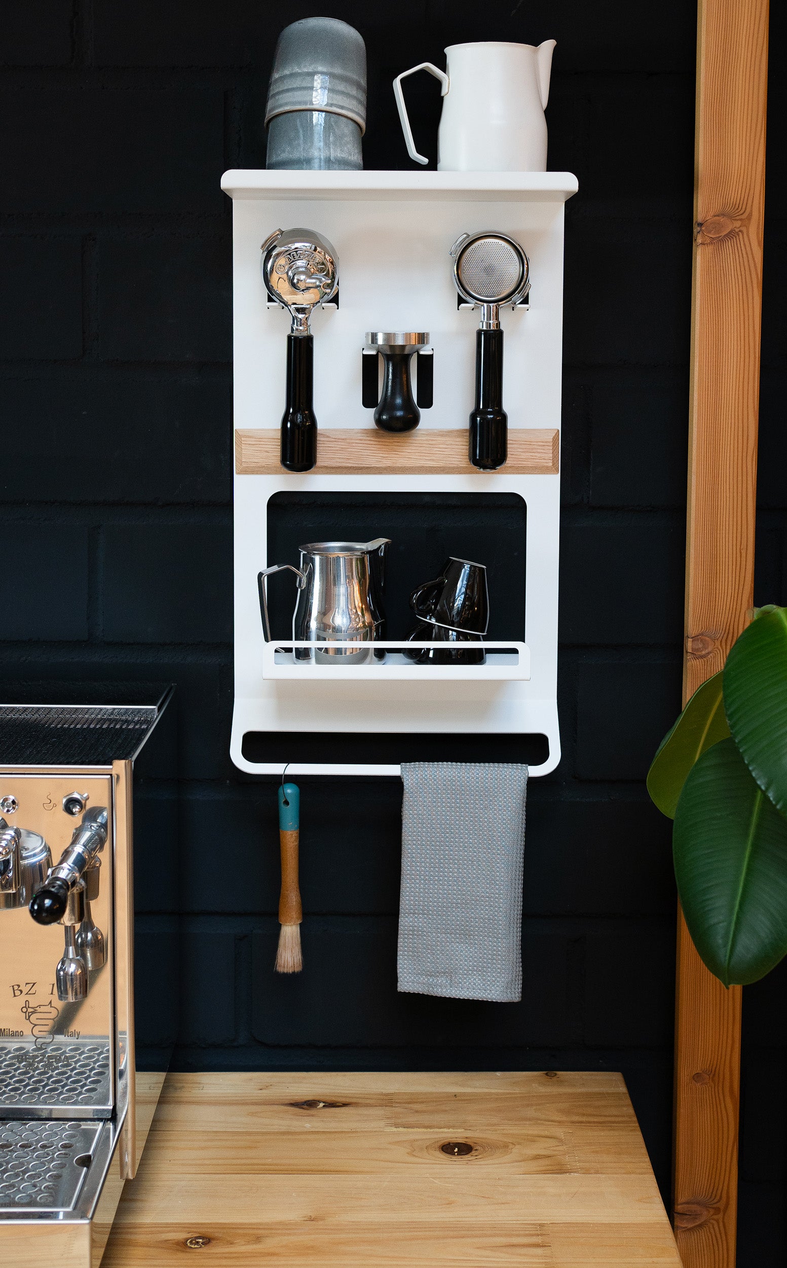 Of het nu gaat om 2 of 3 hangende houders voor tamper of portafilter, staand of aan de muur bevestigd - het rek zal de belangrijkste toevoeging zijn aan je portafiltermachine, ongeacht van welke fabrikant hij is.